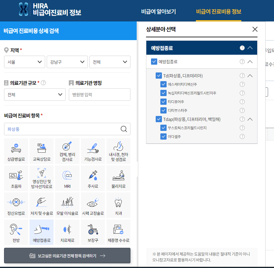 심평원 홈페이지를 통해 백신이 있는 병원 및 비용을 미리 확인할 수 있습니다
