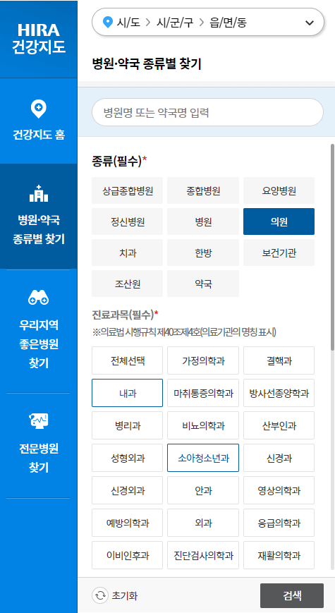 내과, 소아청소년(소아, 청소년일 경우)을 선택 후 검색하시면 병원을 찾을 수 있음