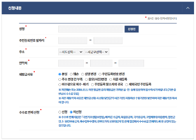 3. ' 주민등록증재발급신청 ' 버튼을 누르고 성명, 주민등록번호 앞자리, 주소, 연락처, 재발급사유, 수수료면제신청을 체크합니다