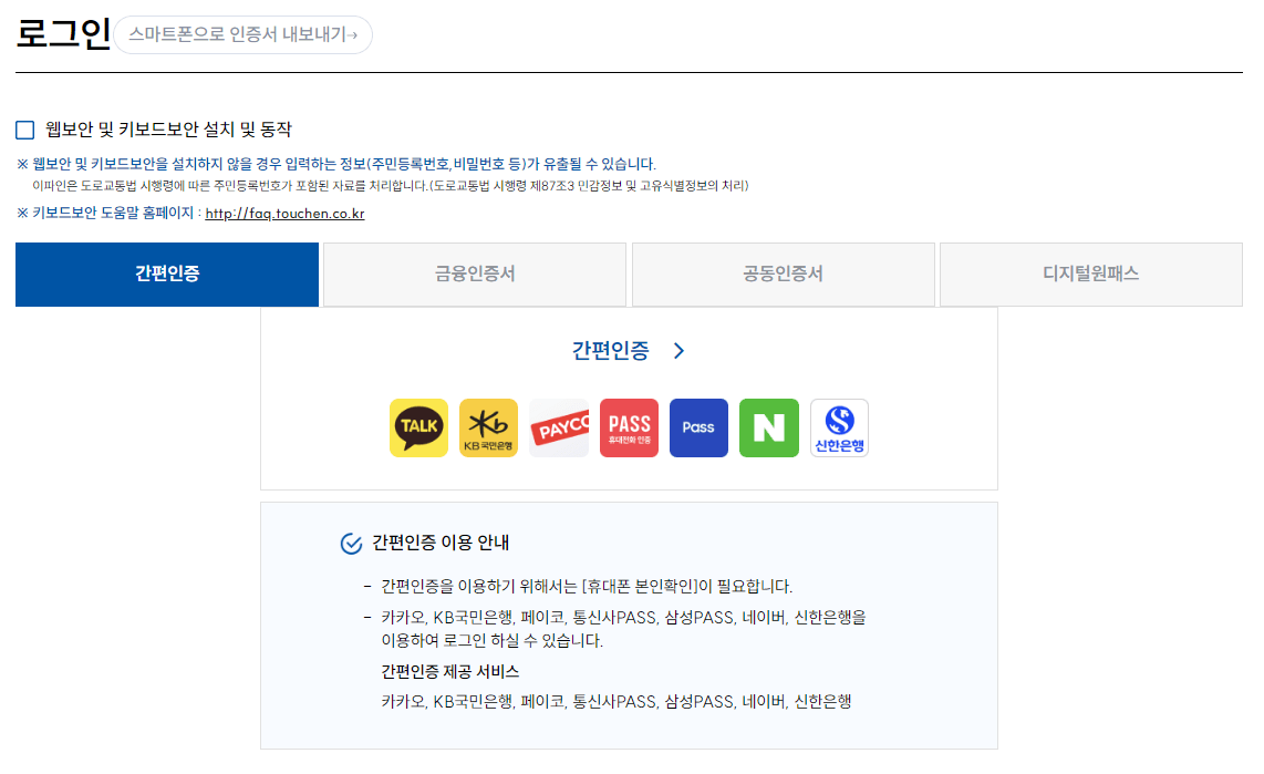 2. 로그인하기 : 간편 인증, 금융인증서, 공동인증서, 디지털원패스 중 하나를 선택하기