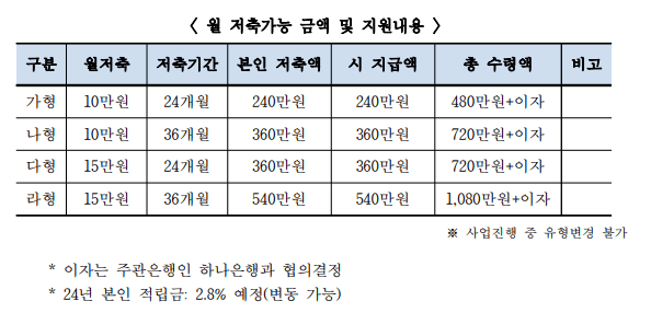 매월 10만원, 매월 15만원 중 선택하여 2년, 3년 저축하면 아래에 해당하는 금액을 지원해줍니다
