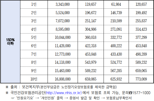 신청인이 속한 가구의 24년 1월~3월 건강보험료 부과 평균액이 중위소득 150% 이하에 속해야 함