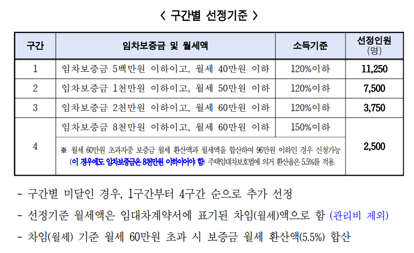 입차보증금, 월세 및 소득기준을 4구간으로 나누어 선정합니다