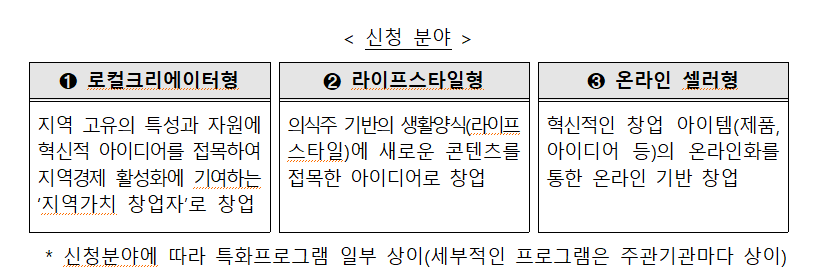로컬크리에이터형, 라이프스타일형, 온라인 셀러형이라는 분야에서 혁신적인 아이디어를 가지고 있는 예비창업자