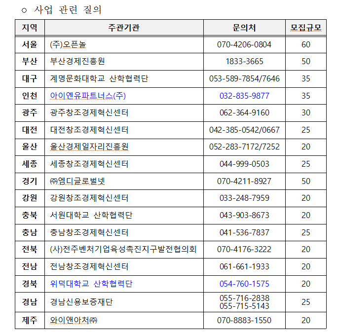 사업 관련 궁금한 점은 해당 지역 문의처로 전화 주시면 됩니다