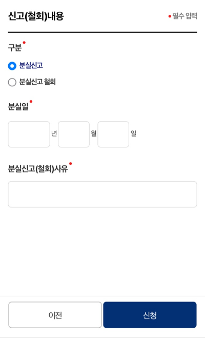 3. 성명, 생년월일, 전화번호, 주소, 구분(분실신고), 분실일, 분실신고사유를 작성 후 '민원신청하기' 버튼을 누릅니다