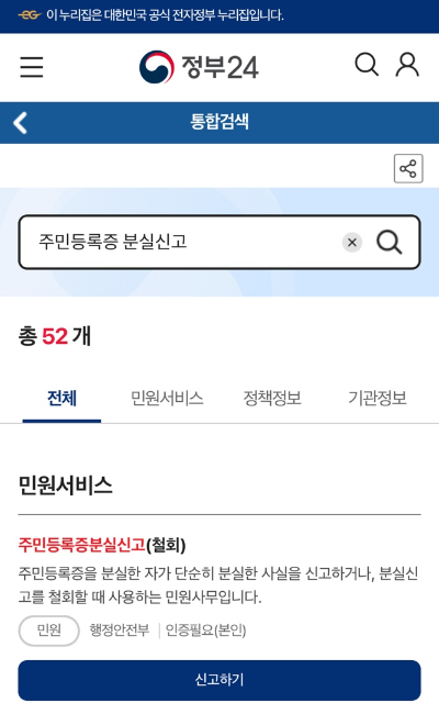 1. 정부 24 모바일에서 '주민등록증 분실신고'를 검색해서 '신청하기' 버튼을 누릅니다