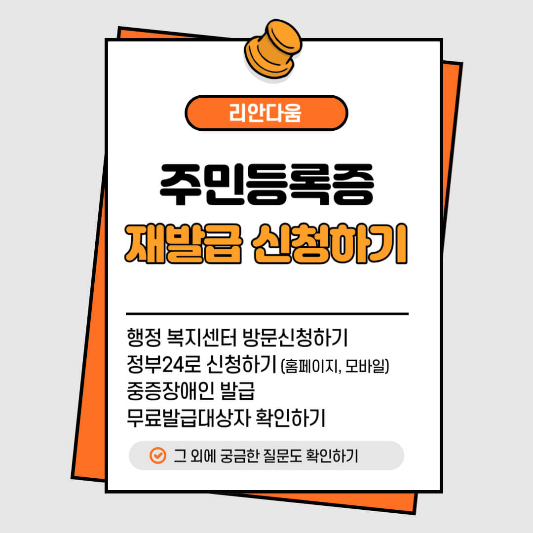 주민등록증 재발급을 위해서는 '행정복지센터(구 동사무소)'에 직접 방문하거나 온라인으로 발급가능합니다